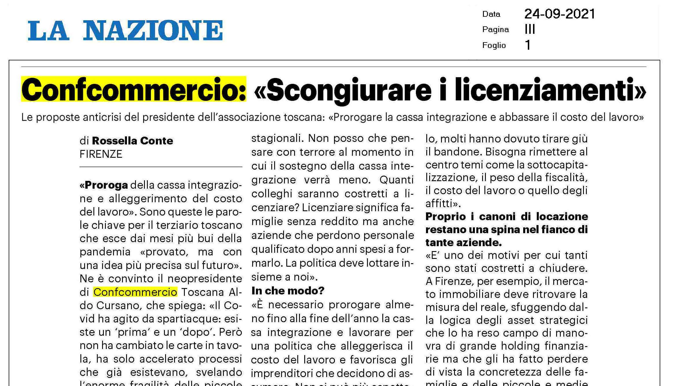 Sulla Nazione del 24 settembre 2021 è uscita l’intervista al nostro presidente regionale Aldo Cursano, che ha illustrato alcune proposte anticrisi: «prorogare la cassa integrazione e abbassare il costo del lavoro». La pandemia ha messo in luce tutta la debolezza del sistema. «Nel 2020, solo nei pubblici esercizi toscani, sono venuti a mancare oltre 20mila contratti stagionali. Non posso che pensare con terrore al momento in cui il sostegno della cassa integrazione verrà meno. Quanti colleghi saranno costretti a licenziare? Licenziare significa famiglie senza reddito ma anche aziende che perdono personale qualificato dopo anni spesi a formarlo. La politica deve lottare insieme a noi».