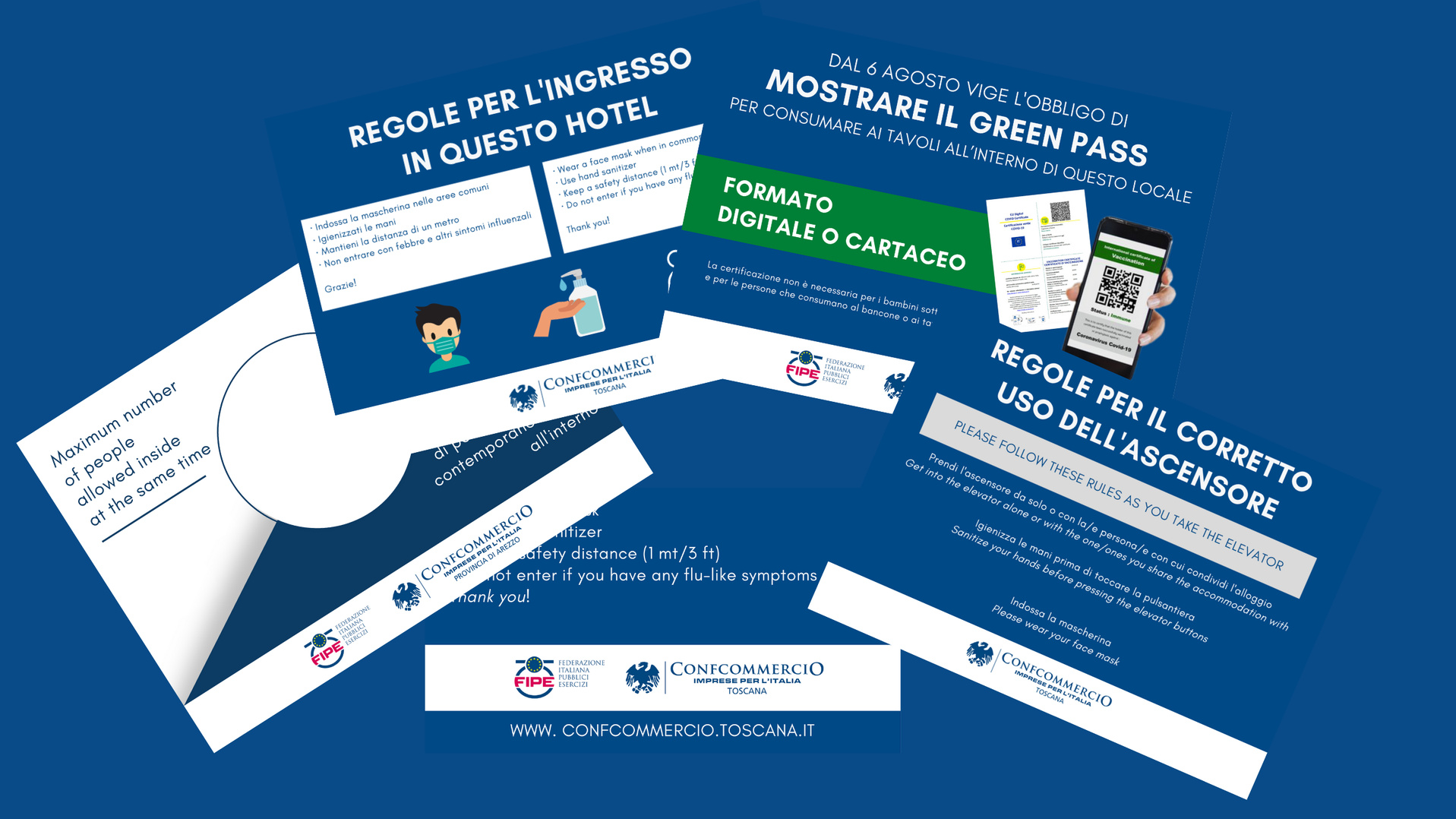 Scarica le locandine, aggiornate nei testi e nella grafica, da stampare e affiggere al pubblico per informare i tuoi clienti delle regole antiCovid in vigore, compresa quella di mostrare il Green Pass per consumare pasti al tavolo all'interno dei locali o utilizzare piscine coperte e spa. I testi sono in italiano e in inglese. Per ulteriori chiarimenti, contatta la sede territoriale Confcommercio più vicina.
