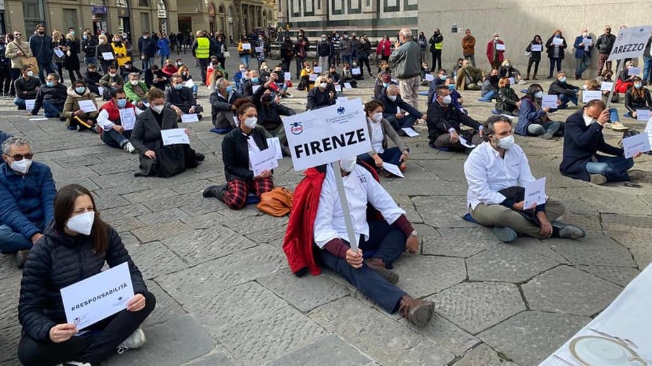 Mercoledì 28 ottobre 2020 si è svolta a Firenze la mobilitazione pacifica, ordinata, silenziosa e partecipatissima voluta da Fipe-Confcommercio Toscana. Sono stati oltre cinquecento gli imprenditori e i lavoratori provenienti da tutte le province toscane per rappresentare il variegato mondo della somministrazione: ristoratori e chef, sommelier e barman, pasticceri e gelatai, pizzaioli e titolari di locali da ballo. Molti di loro si sono seduti intorno alle 16 tovaglie apparecchiate a terra in segno di protesta, con piatti e bicchieri rovesciati a testimoniare simbolicamente l’enorme crisi che sta vivendo il settore a causa delle norme restrittive emanate con il nuovo Dpcm.