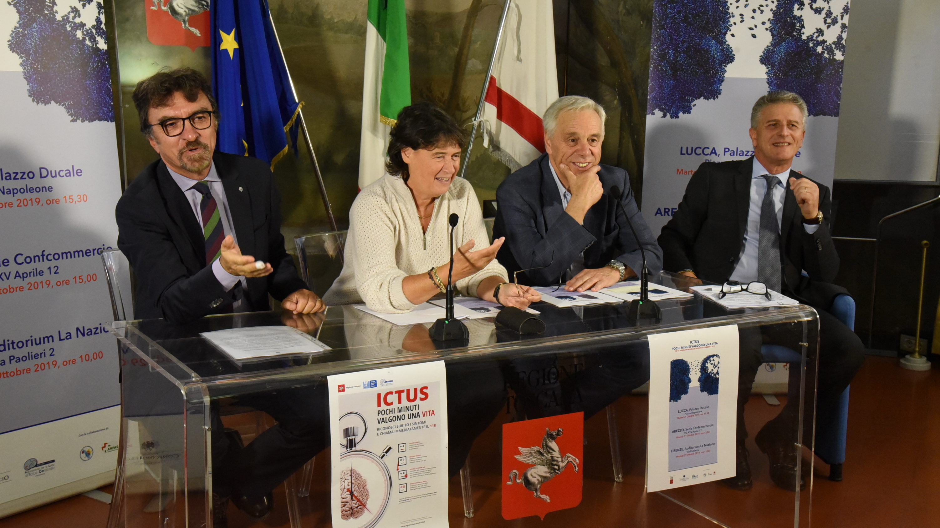 "Ictus, pochi minuti valgono una vita", questo il titolo del ciclo di incontri informativi aperti a tutta la cittadinanza, realizzati in vista della prossima Giornata mondiale contro l'Ictus dalla Fondazione Confcommercio Toscana Onlus con il patrocinio della Regione Toscana e la collaborazione della sezione toscana dell'Associazione A.L.I.Ce. (Associazione per la Lotta all'Ictus Cerebrale), della Federazione regionale delle Misericordie della Toscana, della sezione toscana di Anpas (Associazione Nazionale Pubbliche Assistenze) e del Comitato regionale della Croce Rossa. Martedì 24 settembre la conferenza stampa di presentazione a Firenze con l'assessore regionale al diritto alla salute Stefania Saccardi.