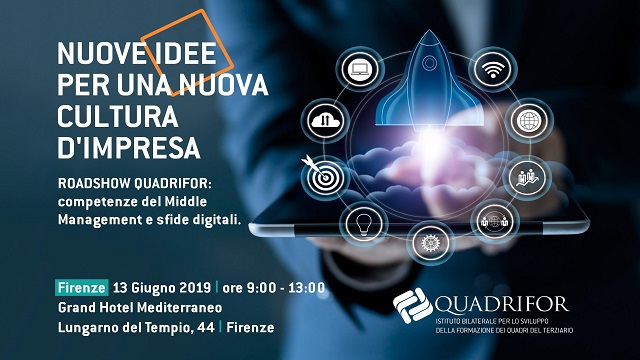 Giovedì 13 giugno 2019 con la collaborazione di Confcommercio Toscana fa tappa al Grand Hotel Mediterraneo di Firenze il roadshow organizzato da Quadrifor “Nuove idee per una nuova cultura d’impresa”. Middle manager e aziende a confronto sulle necessità formative dei quadri in Toscana. Partecipazione gratuita con prenotazione obbligatoria su https://formazione.quadrifor.it/eventi/evento. Appuntamento dalle ore 9 alle 13. Apertura a cura del direttore di Confcommercio Toscana Franco Marinoni. Al termine della mattinata focus group con tutti i partecipanti.