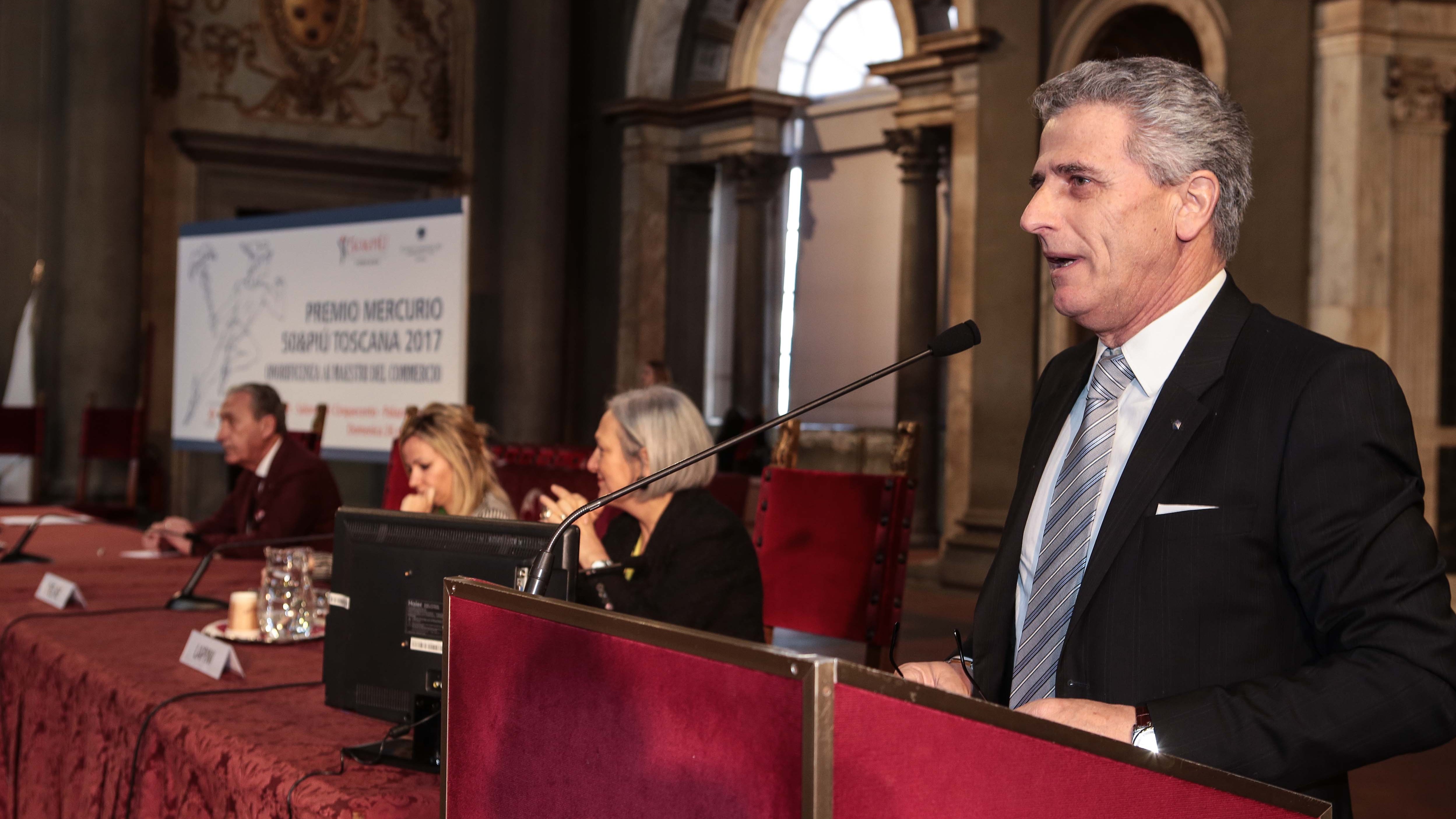 Domenica 7 aprile 2019 si è svolta nel Salone dei Cinquecento a Firenze la cerimonia di consegna del Premio Mercurio 50&Più Toscana, il riconoscimento ideato dall'associazione regionale di ultracinquantenni aderente a Confcommercio, con il patrocinio della Regione Toscana e del Comune di Firenze. A consegnare le targhe con il dio alato del commercio c’erano, insieme alla giornalista Serena Magnanensi che ha presentato l’iniziativa, il presidente del Consiglio Regionale della Toscana Eugenio Giani, l’assessore allo sviluppo economico del Comune di Firenze Cecilia De Re, la presidente di Confcommercio Toscana Anna Lapini, il presidente regionale di 50&Più Antonio Fanucchi e la vicepresidente nazionale Brigida Gallinaro.